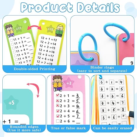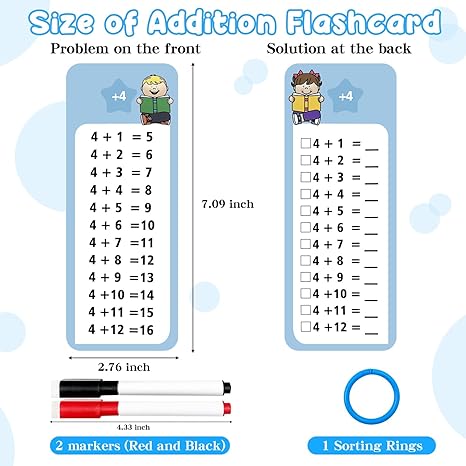 - Compact Design: Addition flashcards measure 2.76x7.09 inches, have Round-edged design, ensure safety and avoid scratching, and easy to storage, you can easily organize your cards using the included binder ring, making it easy to carry and study at any time